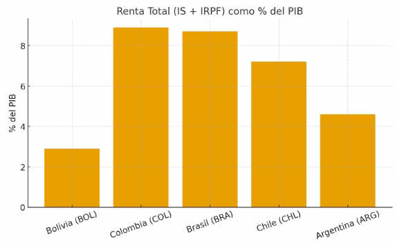 Las cifras hablan por sí solas. La recaudación de Bolivia por Impuesto a las Personas (IRPF) es de apenas un 0.3% del PIB. Para ponerlo en perspectiva, Brasil recauda diez veces más en esta categoría (3.1%), y Chile, seis veces más (1.9%).